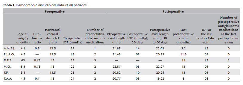 RESULTS: Six eyes from six patients were included in this study. The median age of the patients at the time of surgery was 1.25 yr (range: 0.27-5.41 yr). The mean preoperative intraocular pressure was 25 ± 5.87 mmHg (range: 18-35 mmHg). At baseline, the mean number of hypotensive eye drop medications used was 2 ± 0.63. Postoperatively, the mean intraocular pressure decreased to 10 ± 2.20 mmHg (range: 9-14 mmHg), and none of the patients required hypotensive eye drops. The most common postoperative complication was hyphema, observed in one case on the first postoperative day; however, it resolved within 7 days.