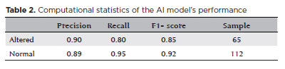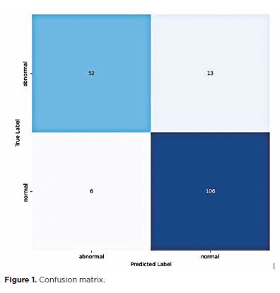 In the test dataset, 65 results were altered and 112 were normal. The model achieved an accuracy of 0.90 and sensitivity of 0.80. The F1 score for the altered and normal exams were 0.85 and 0.92, respectively (Table 2).