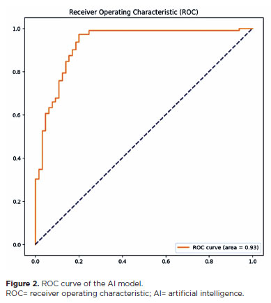 The model achieved an AUC-ROC of 0.93 (Figure 2). In general, an area under the curve (AUC) of 0.5 indicates no discriminatory ability (i.e., ability to differentiate between patients with and without the disease or condition based on the test), AUC of 0.7 to 0.8 indicates acceptable ability, AUC of 0.8 to 0.9 indicates excellent ability, and >0.9 indicates outstanding ability(15).