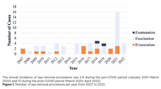 The main limitations of this study are its retrospective nature and reliance on medical record data. The collected data relies on the completeness and accuracy of the codes recorded by the healthcare practitioners. Another limitation of this study, is the limited sample size and data between the years 2007 and 2022. The first case of COVID-19 infection was reported in Wuhan, China in December 2019. The WHO declared COVID-19 as a pandemic on March 11, 2020, and it formally ended the Public Health Emergency (PHE) state in May 2023. A short time later, the United States ended its PHE state. Thus, our study does not cover the complete pandemic period. Nonetheless, during 2022–2023, 6.6 eye removal procedures were performed, representing a 128% increase in the annual rate from that in the prepandemic period.