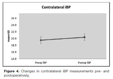 Changes in ipsilateral iBP measurements pre-and postoperatively were not statistically significant (p>0.05). However, the average increase of 0.88 ± 1.61 units in contralateral iBP measurements postoperatively compared with that preoperatively was statistically significant (p=0.006; p<0.01) (Table 1 and Figure 4).