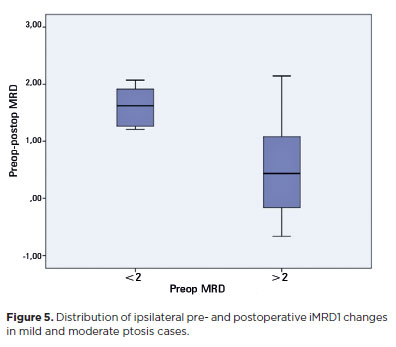 When the preoperative degrees of ptosis were categorized into moderate (iMRD1 <2 mm) and mild (iMRD1 ≥2 mm), the change in iMRD1 in moderate ptosis cases was statistically significantly higher than mild ptosis cases (p=0.022; p<0.05) (Table 2 and Figure 5).