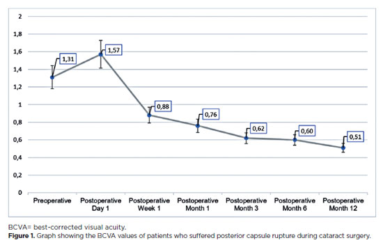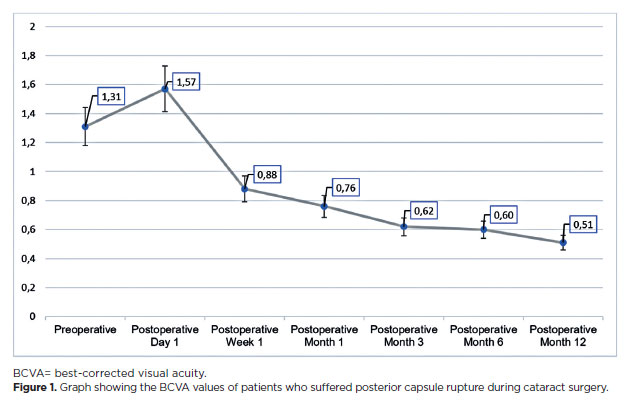 BCVA= best-corrected visual acuity. Figure 1. Graph showing the BCVA values of patients who suffered posterior capsule rupture during cataract surgery.