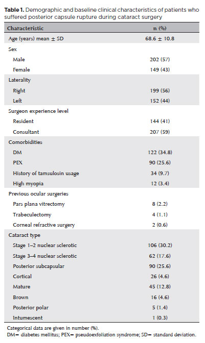 PCR occurred in 351 (199 right, 152 left) eyes of 351 (202 male, 149 female) patients. The mean age was 68.6 ± 10.8 years. The mean follow-up was 13.86 ± 7.68 months. The most frequent concomitant systemic disease was diabetes mellitus (DM), and the most frequent ocular comorbidity was PEX. The preoperative characteristics, previous ocular surgeries, and cataract types of the patients are summarized in table 1. The most common cataract type was stage 1–2 nuclear cataracts in 106 (30.2%) eyes, followed by posterior subcapsular cataracts in 90 (25.6%) eyes.