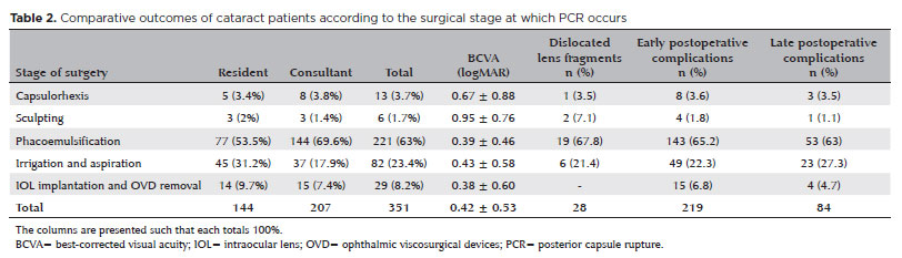Segers et al.(4), studied a large population of 2,853,376 patients and encountered PCR in 31,749 (1.1%) of cataract surgeries. This rate ranged from 0.60% to 1.65%, with a decreasing trend over 10 years. Another study of 1,200 cases by Bai et al.(5) reported a PCR rate of 4.5% in the first 100 surgeries performed by six residents, which declined to 2% in the second 100 cases. Hence, the PCR rate decreases as surgical experience increases, as might be expected(5,7,8). However, Barreto et al.(26), found no difference in the rate of PCR between residents and experienced surgeons. They attribute this to adequate supervision during procedures. Nonetheless, the procedures performed by residents in the present study had a significantly higher incidence of PCR than those performed by consultants, despite supervision in all instances. In addition, since the consultants in our institution handled more difficult and complicated cases, the risk of PCR in resident cases may be higher than we have reported in facilities where this is not the protocol. Given the challenging nature of phacoemulsification surgery, it is not surprising that less-experienced surgeons will encounter PCR more frequently. Still, the necessary precautions should be taken and awareness raised to keep the PCR rates to a minimum.