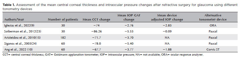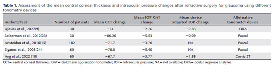 IOP pressure is estimated by tonometry in pre-and postoperative refractive surgery evaluations of myopes. IOP has been found to influence low- and high-order aberrations, which are evaluated by an aberrometer. The Goldmann applanation tonometer (GAT) is the international gold standard. However, it has several limitations. The measurements obtained using this tonometer are affected by scleral stiffness and the thickness and biomechanical properties of the cornea. Measurements exclusively taken in a vertical position can also reduce accuracy. The IOPs of eyes with a corneal thickness <525 µm tend to be underestimated, while those with a corneal thickness >555 µm tend to be overestimated. Therefore, measurement of corneal thickness is recommended when evaluating IOP. Corneal irregularities in astigmatism greater than three diopters tend to cause errors in IOP measurements, leading to underestimation along the flatter axis. In these cases, 90° rotation of the tonometer is recommended to obtain at least two measurements(8).