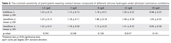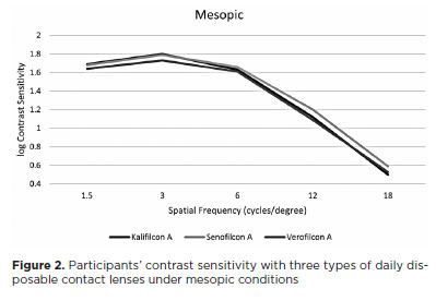 Another study evaluated contrast sensitivity in DDCL wearers under mesopic conditions and found no difference between senofilcon A and verofilcon A at low spatial frequencies but at 18cpd spatial frequency, contrast sensitivity of verofilcon A was higher than senofilcon A (p=0.037)(17). Although the difference was reported to be statistically significant, statistical significance may be possible if the p value was below 0.017 in the evaluation of 3 different DDCLs with post-hoc evaluation with Bonferroni correction(18). In our study, no significant difference was found among senofilcon A and verofilcon A at 18cpd spacial frequency under mesopic conditions. We found that contrast sensitivity with kalifilcon A was significantly higher than with verofilcon A at 3 cpd and with senofilcon A than verofilcon A at 12 cpd under mesopic conditions.