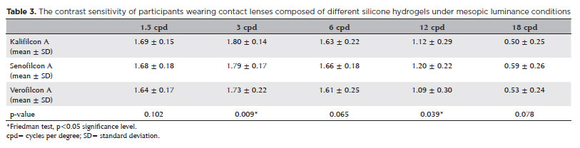 There were no statistically significant differences between the three different DDCLs at spatial frequencies of 1.5, 3, 6, and 18 cpd under photopic conditions (p=0.391, p=0.248, p=0.130, p=0.141, respectively). Contrast sensitivity was significantly higher with senofilcon A compared to kalifilcon A at a frequency of 12 cpd under photopic conditions (p=0.008). There was no significant difference between kalifilcon A and verofilcon A (p=0.446) or between senofilcon A and verofilcon A (p=0.021) (Table 2). There were no significant differences between the three different DDCLs at spatial frequencies of 1.5, 6, or 18 cpd under mesopic conditions (p=0.102, p=0.065, p=0.078). At 3 cpd under mesopic conditions, there was a statistically significant difference in contrast sensitivity with verofilcon A compared with kalifilcon A (p=0.001). There was no statistically significant difference between senofilcon A and kalifilcon A and between senofilcon A and verofilcon A at 3 cpd under mesopic conditions (p=0.632, p=0.028). At a frequency of 12 cpd, contrast sensitivity with senofilcon A was statistically significantly higher compared to verofilcon A (p=0.004), while there was no significant difference between senofilcon A and kalifilcon A (p=0.024) nor between verofilcon A and kalifilcon A (p=0.409) (Table 3).
