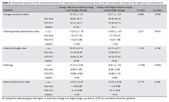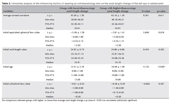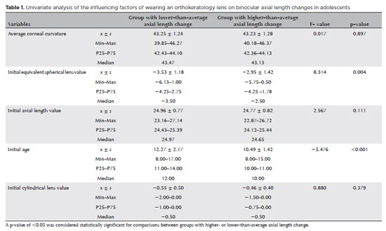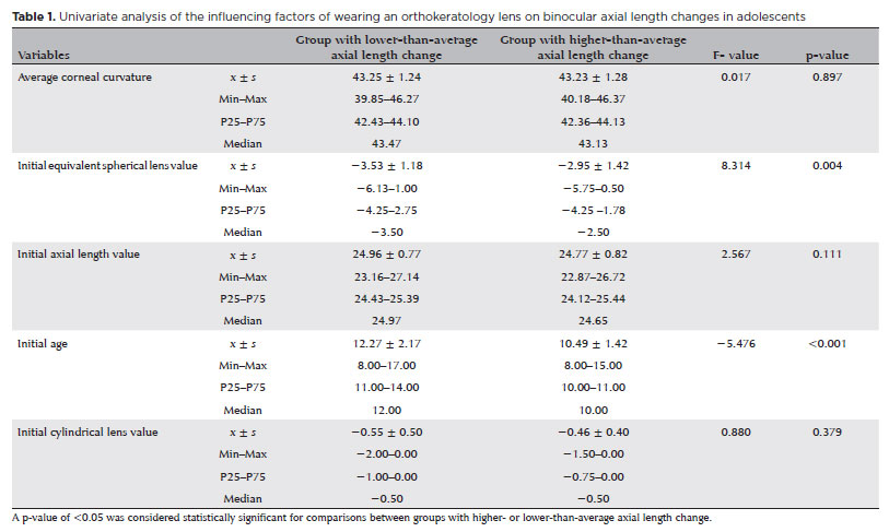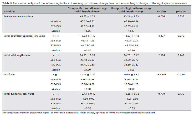 Univariate analysis of factors influencing axial length changes in adolescents wearing Ortho-K lenses