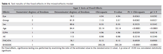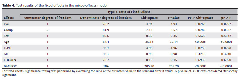 Similarly, univariate analysis was performed to assess factors affecting axial length changes in the right eye of adolescents wearing Ortho-K lenses. The findings revealed that age (F=−3.308, p<0.001) was the only statistically significant factor influencing axial length changes in the right eye (Table 3).