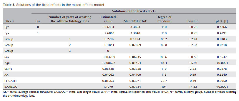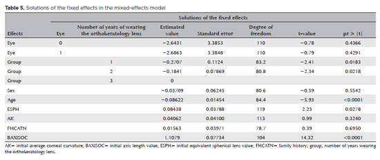 RESULTS: Age (p<0.05) and initial equivalent spherical value (p<0.05) were significant predictors of axial length changes in both eyes and the left eye. For the right eye, only age was a significant factor (p<0.05). The mixed-effects model revealed that the difference between the left and right eyes, duration of orthokeratology lens use, age, initial equivalent spherical lens value, and initial axial length significantly influenced axial length changes in adolescents (p<0.05).