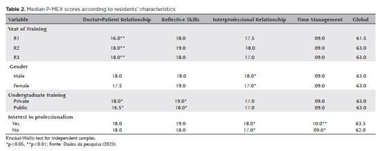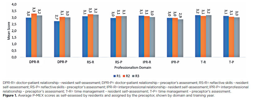 RESULTS: All 48 residents were included, with equal representation across the 3 years of residency. The majority were female (58.3%) and between 25 and 29 years old (66.7%). The average professionalism score on the professionalism mini-evaluation exercise given by the preceptors was 3.0 (75%). A significant association was found between the year of training and the score in the doctor-patient relationship domain, with first-year residents showing lower scores (p=0.002). Male residents had higher scores in the “Interprofessional” domain (p=0.031). Graduates from private medical schools scored higher in both the “doctor-patient relationship” (p=0.015) and “reflective skills” (p=0.033) domains. Lower interest in professionalism was linked to lower scores in the “Interprofessional relationships” (p=0.033) and “time management” (p=0.003) domains. A strong correlation was observed between preceptor’s professionalism mini-evaluation exercise scores and residents’ self-assessed professionalism mini-evaluation exercise scores (r=0.917). However, the correlation between the self-assessed professionalism mini-evaluation exercise and the Pennsylvania questionnaire scores was weak (r=0.226).