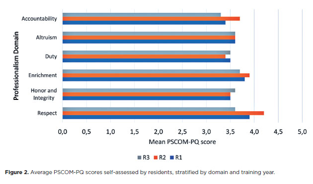 Observations were carried out in two settings: ambulatory care and emergency care. A total of 384 medical encounters were evaluated, with 4 encounters per resident in each setting. These assessments were integrated into the preceptor’s regular duties, and residents were unaware of when they would be observed. At the end of the rotation period, residents completed a questionnaire before receiving feedback from the preceptor. The questionnaire administered to the residents included three parts: the first part collected sociodemographic and academic information; the second part included the P-MEX items; and the third part comprised the PSCOM-PQ items. The PSCOM-PQ is a 36-item self-assessment tool organized into six domains: accountability, enrichment, honor and integrity, altruism, duty, and respect. Responses are recorded on a 5-point Likert scale. The PSCOM-PQ total score is calculated either as the mean score (ranging from 1 to 5) or as a sum score (ranging from 36 to 180)(11,12). Each domain, containing six items, has a score range from 6 to 30.