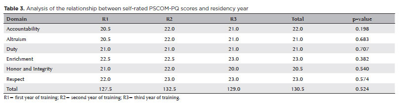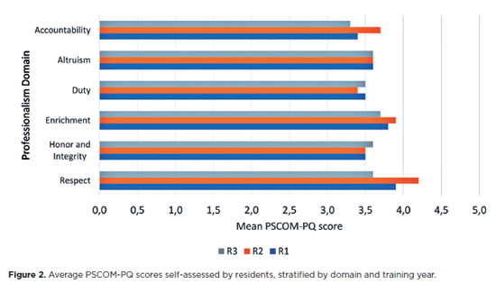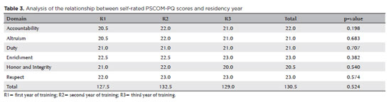 The P-MEX consists of 21 items distributed across four domains: doctor-patient relationship(6), reflective skills(6), interpersonal relationships(6), and time management(3). Each item is rated by an observer or self-assessed by the resident using a 4-point Likert scale(8). The PSCOM-PQ includes 36 items equally divided among six domains: accountability, altruism, duty, enrichment, honesty and integrity, and respect. Each item in the PSCOM-PQ presents a statement that residents evaluate through self-assessment using a 5-point Likert scale. Furthermore, residents rated the relevance of each statement to their clinical practice. Both instruments have been translated and culturally adapted for use in Brazilian Portuguese(10-12).