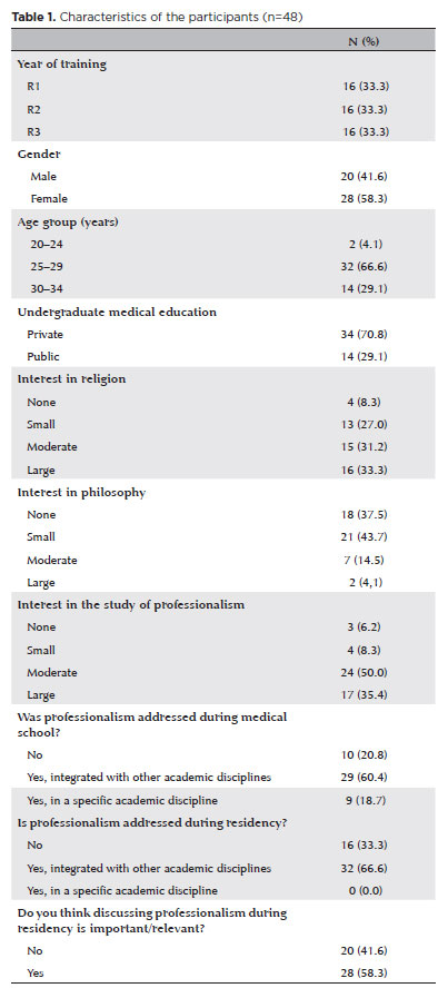 METHODS: A cross-sectional study was carried out involving 48 ophthalmology residents in Brazil. Professionalism was assessed using the professionalism mini-evaluation exercise, completed by both preceptors and residents, and the Pennsylvania State College of Medicine Professionalism Questionnaire, completed by the residents. The association between the professionalism score assigned by the preceptor through the professionalism mini-evaluation exercise and various sociodemographic and educational variables was assessed. The correlation between the residents’ self-assessment across both instruments and the preceptor’s assessments was measured using Spearman’s Rho.