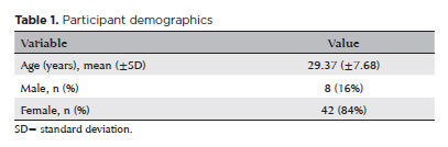 The study cohort included 50 first-time soft-contact lens users, consisting of 8 (16%) men and 42 (84%) women, with an average age of 29.37 (±SD) years (Table 1).