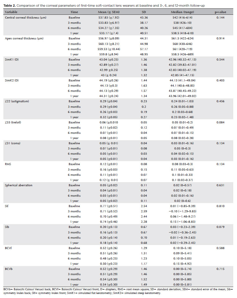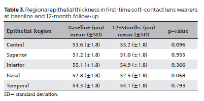 The mean baseline measurements of central corneal thickness (CCT) and apex corneal thickness were 537.83 (±SD) µm and 556.97 (±SD) µm, respectively. A slight, non-significant decrease in the mean CCT was observed after 1 year of SCL use (533.17 [±SD] µm, p=0.144).