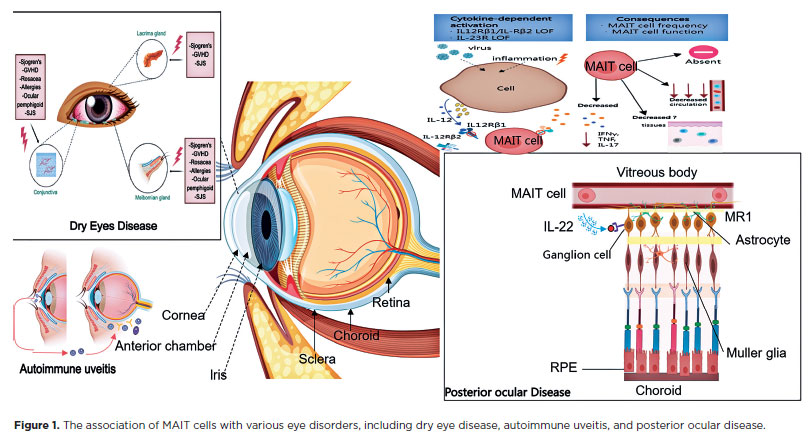 Owing to their unique utilization of TCR, these cells are pivotal in the immune system's defense against microbial infections, and are associated with autoimmune conditions like uveitis and other inflammatory diseases affecting the eyes. Depending on the microenvironment and specific antigens, MAIT cells can exert proinflammatory and regulatory effects. In autoimmune uveitis, they can promote tissue damage through cytokine release, whereas in other contexts, they may help regulate immune cell activity and maintain ocular immune tolerance. Recent studies highlight the potential therapeutic benefits of modulating MAIT cell activity in ocular autoimmune disorders, suggesting that fine-tuning their functionality could alleviate disease symptoms and improve patient outcomes(1).