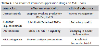 MAIT cells may play a pivotal role in ocular diseases involving inflammation and infection. Given their significance in mucosal immunity, MAIT cells hold significant therapeutic promise. Evidence suggests MAIT cell activation in ocular conditions such as uveitis and AMD, where they may contribute to the pathophysiological mechanisms underlining these disorders. Modulating MAIT cell activity could inspire novel treatment strategies for treating these conditions; for instance, enhancing pathogen clearance or regulating inflammatory responses to reduce tissue damage and preserve vision. Furthermore, MAIT cells may be explored in ocular tumor immunotherapy As our understanding of MAIT cell functions in ocular health and disease evolves, their therapeutic applications could significantly reshape clinical practices. Although no drug targets MAIT cells specifically, recent findings suggests that certain immunosuppressive agents may indirectly affect their activity (Table 2). Emerging evidence also suggests that vitamin D and its receptor signaling may modulate MAIT cell function, promoting anti-inflammatory IL-10 and suppressing IL-17 in autoimmune contexts, though direct mechanistic links remain unclear. Although clinical observations have noted altered MAIT cell activity in vitamin D-deficient individuals, the effects are context-dependent (pro- or anti-inflammatory) and require validation.