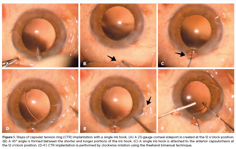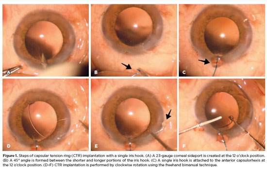 Several techniques have been described for CTR insertion. Common approaches include the use of an injector or a freehand bimanual technique, which guides the leading eyelet into the capsular bag(1). In both methods, the posterior end is advanced, the anterior end is maneuvered around the capsular bag, and finally, the posterior end is released beneath the capsulorhexis. The ideal CTR insertion technique should be easy to perform and should avoid additional zonular damage. Consequently, variations such as the fishtail, modified fishtail, and suture-guided techniques have been reported(1,5-7). Additionally, capsular or iris hooks can be used during CTR implantation, similar to their role in phacoemulsification(8).