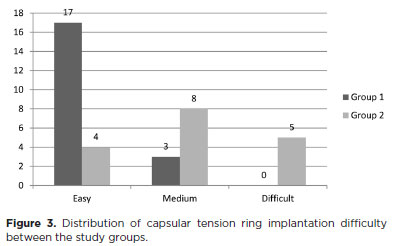 The mean degree of zonular weakness score was significantly higher in Group 1 (3.35 ± 0.45) than in Group 2 (2.71 ± 0.59; p=0.02). The difficulty of CTR implantation also differed significantly between the groups, with implantation rated as easier in the iris retractor group (p<0.001; Figure 3). In Group 2, "difficult" rating was assigned to five patients, whereas none in Group 1 received this rating. In these five cases, the posterior end of the CTR migrated into the iridocorneal angle or ciliary sulcus, complicating the procedure. Significant complications such as capsular rupture or CTR dislocation did not occurred during CTR implantation in both group. However, capsular rupture occurred during phacoemulsification in two patients initially scheduled for CTR implantation. Consequently, CTRs were not implanted in these cases, and they were excluded from the study.