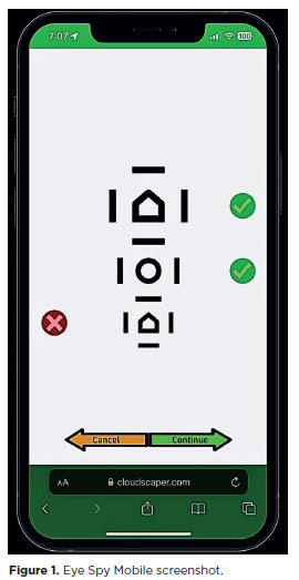 The Eye Spy Mobile application proved efficient and reproducible, adhering to a true logMAR design. This contrasts with less standardized smartphone applications such as PEEK(18) and DigiVis(19), which use non-logMAR designs and less consistent optotypes, leading to variability in stroke width and symbol size.
