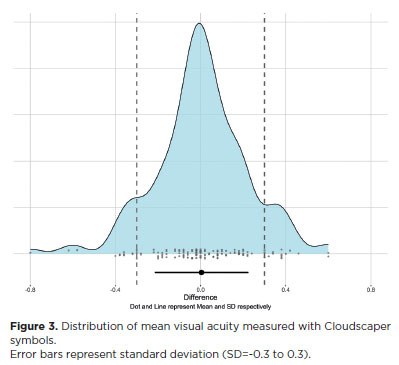 RESULTS: The mean logMAR visual acuity with LEA symbols was 0.12 (standard deviation [SD]=0.18; range, -0.10 to 0.80), while with Cloudscaper symbols it was 0.18 (SD=0.19; range, -0.10 to 0.80). The mean difference between Cloudscaper symbols and LEA symbols was 0.099 logMAR (approximately 0.5 optotypes; SD=0.08; range, 0.0-0.14; p<0.0001). Cloudscaper symbols slightly underestimated visual acuity compared to LEA symbols. Visual acuity measured by both methods was highly correlated (Spearman's r=0.74, p<0.0001). The mean visual acuity difference between Cloudscaper symbols and the Snellen E chart was 0.0045 (p=0.805; 95% confidence interval [95% CI]), whereas the difference between LEA symbols and Snellen E was 0.0883 (p<0.001; 95% CI).