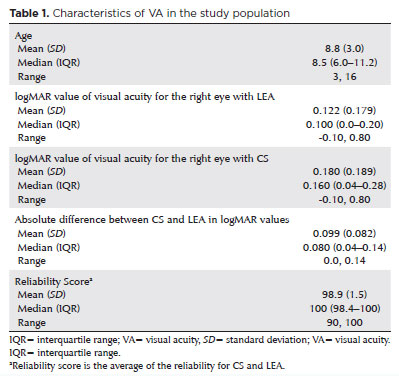 All 560 participants completed the tests and were included in the analysis. The mean age was 8.8 yr (SD=3.0; range, 3-16 yr). Participant age and VA results for each optotype as well as their differences are summarized in table 1. Only right-eye (OD) VA measurements were analyzed.