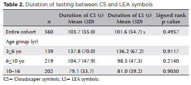 METHODS: A total of 560 children aged 3-16 yr underwent visual acuity test with both Cloudscaper symbols and LS. The test application was standardized using the EyeSpy algorithm. Additionally, 147 participants were tested with the standard Snellen E paper chart. Paired t tests were performed to assess the clinical significance of logMAR visual acuity differences.