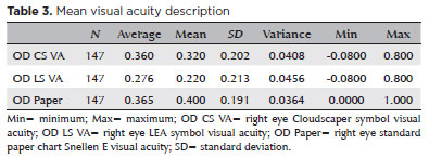 Among the 147 children who also completed the SE paper chart test, mean VA was 0.360 logMAR (SD=0.201; range, 0.080-0.800) with CS (Figure 3), 0.276 (SD=0.213; range, 0.080-0.800) with LS, and 0.365 (SD=0.191; range, 0.000-1.000) with SE (Table 3). The mean difference between CS and SE was 0.0045 logMAR (p=0.805; 95% confidence interval [95% CI]), while the mean difference between LS and SE was 0.0883 logMAR (p<0.001; 95% CI).