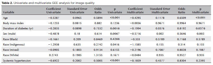 In the non-mydriatic group, univariate GEE regression identified systemic hypertension, age, diabetes duration, male gender, and indigenous race as factors significantly associated with reduced image gradability. Systemic hypertension had the strongest effect, with hypertensive patients exhibiting approximately 50% lower odds of gradable images compared with non-hypertensive patients (odds ratio [OR]=0.50; 95% confidence interval [95% CI], 0.34–0.74; p=0.0005). Increasing age also significantly reduced image gradability (OR=0.59; 95% CI, 0.49–0.71; p<0.0001). Similarly, longer diabetes duration was associated with decreased image quality (OR=0.75; 95% CI, 0.63–0.90; p=0.0016). Male gender was also a significant predictor, associated with lower odds of high-quality images than female gender (OR=0.61; 95% CI, 0.43–0.87; p=0.0067).