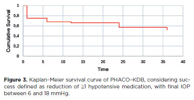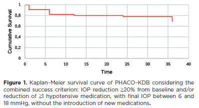 With respect to IOP reduction, an average decrease of 20% was maintained throughout the first year of follow-up. This result is consistent with previous studies reporting reductions between 11% and 34% when KDB is combined with cataract surgery(10,13,14). At 36 months, the IOP reduction was 14.8%, which is lower than the 34.7%-36.9% reductions described elsewhere(16,17). This difference may be explained by the baseline characteristics of our cohort, in which most patients already had well-controlled IOP (<18 mmHg) and lacked major predictors of large reductions, such as high baseline IOP, short axial length, pseudoexfoliation syndrome, or dense cataracts(18,19). Despite this, the procedure provided consistent IOP-lowering benefits, even in patients with mild-to-moderate, stable disease.