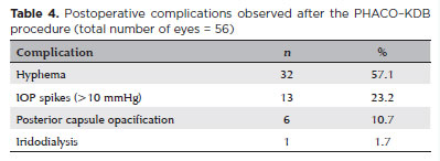 Postoperative complications were generally mild and self-limited. Hyphema was the most frequent (57.1%), followed by transient IOP spikes (23.2%) and posterior capsule opacification. All hyphema resolved spontaneously within 1 week without intervention. A single case of minor intraoperative iridodialysis was reported and resolved uneventfully. No hypotony, malignant glaucoma, or reoperations were observed.