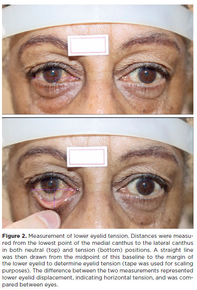 Lower eyelid tension was assessed using a validated digital technique(16). Standardized photographs were taken with patients in primary gaze. Vertical traction was applied to the lower eyelids, and measurements were made using ImageJ 1.33μ software. Horizontal eyelid displacement represented eyelid tension (Figure 2).