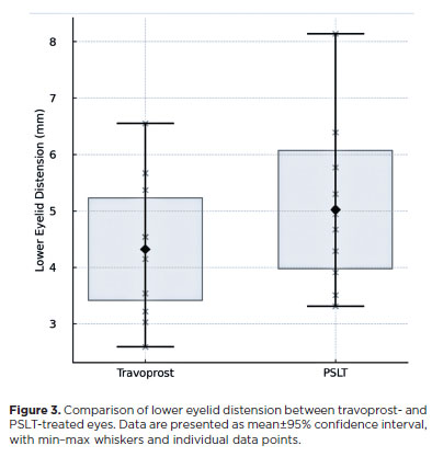 Patients treated with travoprost exhibited a mean reduction of 0.70 mm in the amplitude of lower eyelid distension compared with eyes treated with PSLT. The average eyelid tension in travoprost-treated eyes was 4.32 mm, whereas laser-treated eyes showed an average tension of 5.02 mm. Statistical analysis revealed a significant difference between the two groups (p<0.001; Figure 3).
