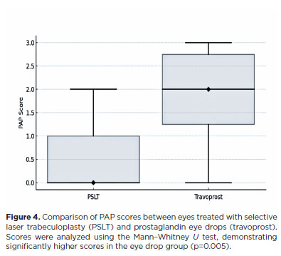 RESULTS: Ten patients met the inclusion criteria for this subanalysis. Travoprost-treated eyes had significantly lower mean lower eyelid distension compared with Pascal selective laser trabeculoplasty-treated eyes (4.32 mm vs. 5.02 mm; mean difference: 0.70 mm; p<0.001). Prostaglandin-associated periorbitopathy scores were significantly higher in the travoprost group, reflecting more pronounced changes in ptosis, periorbital hyperpigmentation, and eyelid retraction.