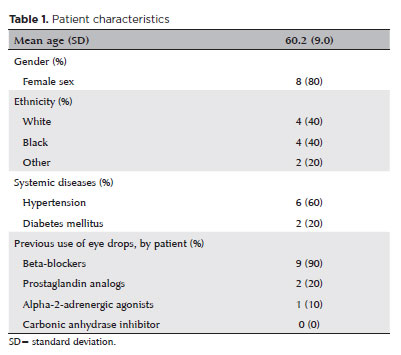 Ten patients met the inclusion criteria for this case-control study. The mean age of participants was 60.2 ± 9 yr, with the majority being women (80%) and 40% identifying as White. Prior to the washout period, patients were using one or two hypotensive eye drops. Most were on beta-blockers (nine patients), while two were using prostaglandin analogs (Table 1).