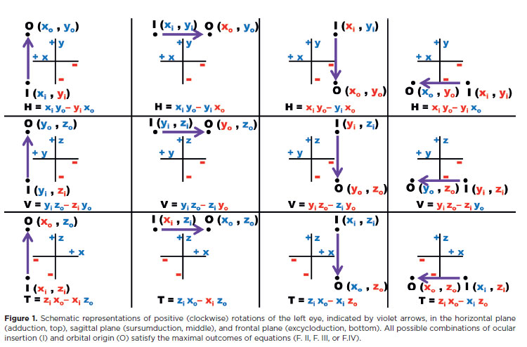 Determining the position of this vector in space – and, consequently, the rotational components of a muscle’s contraction in the horizontal (H), vertical (V), and frontal/torsional (T) planes – requires theoretical consideration of (a) the coordinates of the muscle’s origin O (xo, yo, zo); (b) those of its insertion, I at the primary gaze (xi, yi, zi); and (c) their information after a rotation defined by components H, V, and T in each (2-4).