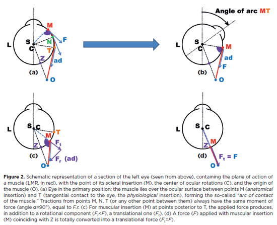 It is not theoretically convenient that the maximal rotational efficiency of a force be limited to a single point of tangential application on the scleral surface, but rather that it extends over a larger superficial area. In other words, the muscle must lie over the eye, that is, with an arc of contact (Figure 2).