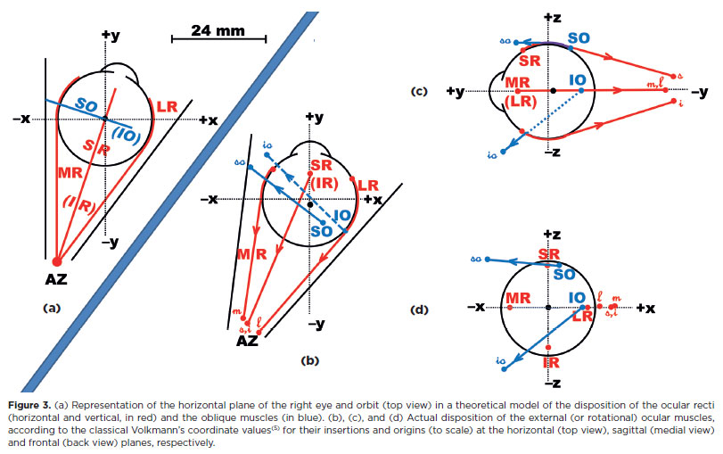 Therefore, although the disposition of ocular muscles to produce eye rotations could in theory be entirely free (Figure 1), the requirement of large arcs of contact limits some alternatives which could otherwise be troublesome. For instance, the existence of a muscle (arc of contact) passing by the anterior or posterior parts of the eye makes the muscle paths (from insertions I to their respective origins O) parallel to the x-orbital axis (Figure 1, second and fourth columns from the left) which should be avoided. In addition, since the anterior part of the eye must remain free to transmit light, the origins of such muscles should be close to the posterior segment. The actual structure of the human orbit – as the result of phylogenetic evolution – appears to be the natural answer to such needs. In the horizontal plane, a close similarity is observed between the “ideal” (Figure 3a) and the actual (Figure 3b) muscular dispositions