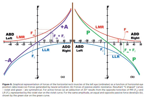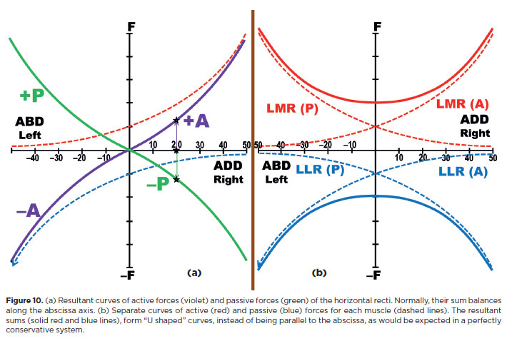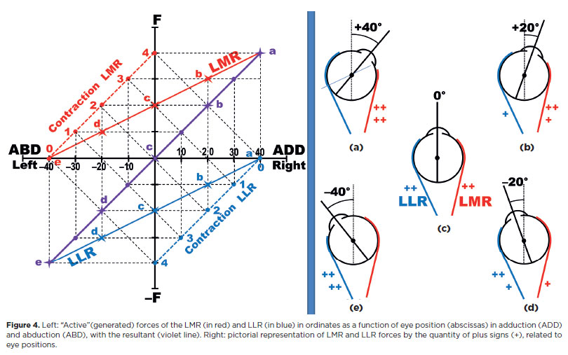 In principle, it might be expected that the variation of forces in a pair of agonist-antagonist muscles would be perfectly symmetrical relative to a “median” position (the primary position) but inverted - that is, the greater the action of one, the smaller that of the other. In addition, the variation of forces due to reciprocal innervation for a desired result (e.g., adduction) and the respective inhibition of the antagonist (relaxation of abduction, therefore allowing more adduction) might be expected to be perfectly linear in the case of a perfectly elastic system. This leads to a graphical and pictorial representation of such forces (Figure 4).