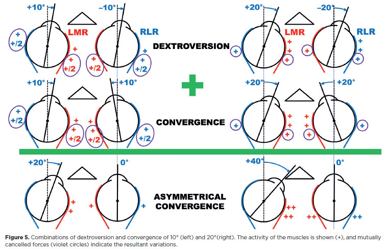 For binocular vision directed to points in space requiring different amounts of rotation in each eye - or for a “final” fusional correction according to Hering's law - disjunctive binocular motions (vergences) are provided. Therefore, vergences and versions may be summed, sometimes resulting in no rotation in one eye and asymmetrical convergence In the other (Figure 5). In the eye without movement, isometric contractions (“co-contractions”) occur.