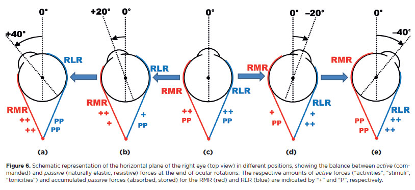 As previously described, the oculomotor system organizes rotational ocular muscles functions in pairs. Thus, even for a “simple” rotation, such as rightward movement of the right eye, contraction of the right lateral rectus muscle (RLR) and relaxation of the right medial rectus muscle (RMR)-Sherrington's law-are required(*7). For the left eye to conjugate in this same “right gaze,” coordination between contraction of the left medial rectus muscle (LMR) and the RLR-Hering's law-is also necessary, with Sherrington's law simultaneously applying to the left eye. Finally, if this “right gaze” is directed at a finite distance, “fusional” (binocular) convergence is also required. In summary, even a simple abduction of the right eye depends not only on RLR contraction but also on RMR relaxation, though other simultaneous commands for the left eye are required.