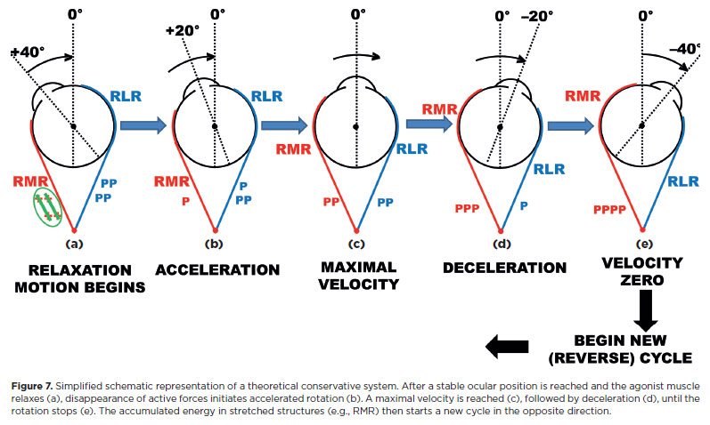 If no other forces acted, the system would continue in perpetual harmonic motion, like a pendulum (Figure 7). On the contrary, after a rapid “return” toward the central position, the rotation stops (Figure 8). During contraction, progressive activation of a muscle, combined with reciprocal inactivation of its antagonist, is countered by increasing passive (resistive) forces in stretched tissues (Figure 8a-c). Part of the command energy is converted into motion (kinetic energy), part is stored as potential energy in stretched periocular structures, and the remainder is lost - either dissipated as heat through friction or through inelastic deformation of viscous periocular components (e.g., conjunctiva, soft tissues, or the so-called “check ligaments”).