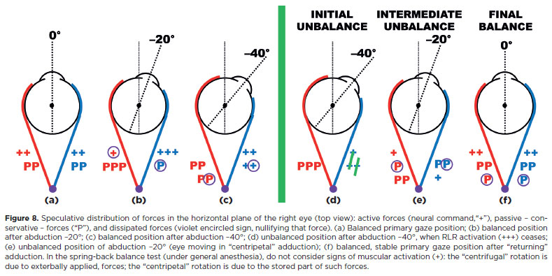 Although periocular structures (including the muscles) could theoretically absorb energy whether shortened (like a compressed spring) or elongated (like a stretched rubber band), they behave “passively” mainly as elastic bands. Experimental data support this: After conjunctival opening (e.g., nasally) or disinsertion of a muscle (e.g., the medial rectus), the eye deviates to the opposite side (temporally)18-101. If the conjunctiva or muscle had accumulated energy to push the eye (like a compressed spring), removal of that push should result in adduction. Instead, abduction occurs. Therefore, the schematic representation in Figure 4 can be improved by considering the balance of forces at the end of a rotation (Figure 6) as due to periocular structures - mainly the muscles - acting as elastic bands.