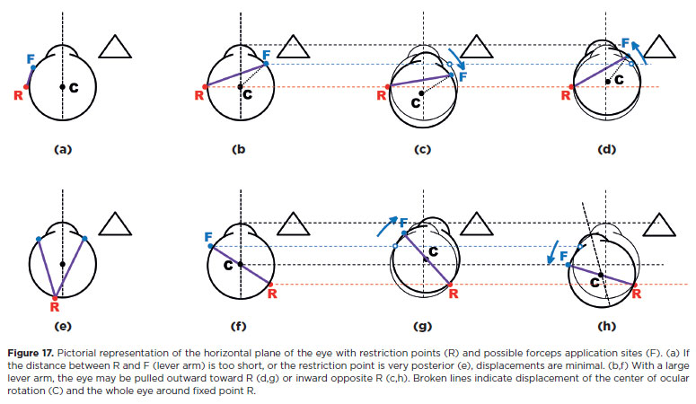 Finally, transposition may also serve to partially or completely neutralize the action of a muscle while leaving it inserted in the eye(22). For example, suppose a rectus muscle is split into two halves and each is reinserted symmetrically on opposite sides of its original plane of action. 1n that case, the effective insertion shifts to an imaginary point inside the globe. The lever arm for torque generation is then shorter than the ocular radius of curvature. Torque becomes null when the “effective” insertion coincides with the ocular rotation center, eliminating rotation by that muscle. While technically demanding, partial symmetrical transpositions (reducing lever arm length and decreasing the angle of force application) are ease to perform, effectively weakening the muscle (Figure 14).