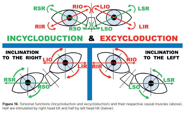 For vertical deviations, rotations must be assessed in tertiary positions, which correspond to the diagnostic positions of the cyclovertical muscles (diagonally situated relative to the primary position, between secondary positions).