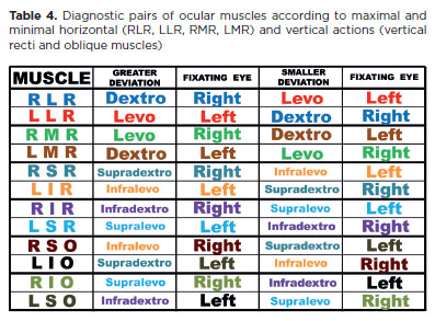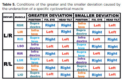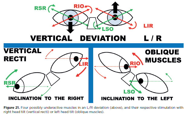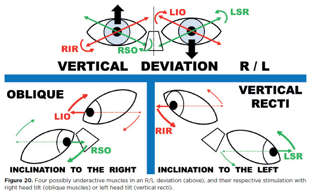 (*14) The prevailing diagnosis (in blue or red) corresponds to the fixating eye (respectively right or left) with which the greater deviation occurs, whereas its relative position (respectively “above” or “below”) estimates its dysfunctional activity (“over” or “under”)