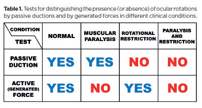 (*11) It is convenient to avoid the ambiguity of meanings “positive” (or “negative") to designate an observed result of a (passive) duction test, since such result is opposite to the respective and consequent diagnosis. In fact, if a “positive" (passive) duction is referred when an intended rotation is absent (which means a restricted motion), the term (“positive”) before “duction” may be erroneously taken as indicative of a “good” (present) tested “duction”. Conversely, if a “positive” (test of) generated force is used to mean absence of forces (muscular paralysis) it may be erroneously taken as a “positive” test of “generated forces”.