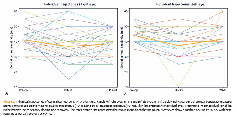 Individual trajectory analysis (Figure 2) revealed substantial intersubject variability in both the magnitude and pattern of sensory changes. Most eyes exhibited a marked reduction in sensitivity at PO-30, followed by variable degrees of recovery at PO-90 (Figure 2A, right eyes; Figure 2B, left eyes).